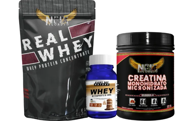 Combo con Real Whey 80%, Creatina Fruit Punch 300 g y una Mini Ultraprotein80 de regalo. Máxima calidad, fuerza, recuperación y practicidad en un solo pack.