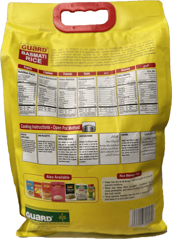El Arroz Basmati 5 KG Guard es un arroz premium de origen 100% pakistaní, reconocido por su aroma delicado, textura liviana y granos extra largos. Su presentación de 5 kg es ideal para familias, restaurantes o consumidores que buscan un producto de alta calidad y rendimiento prolongado.
